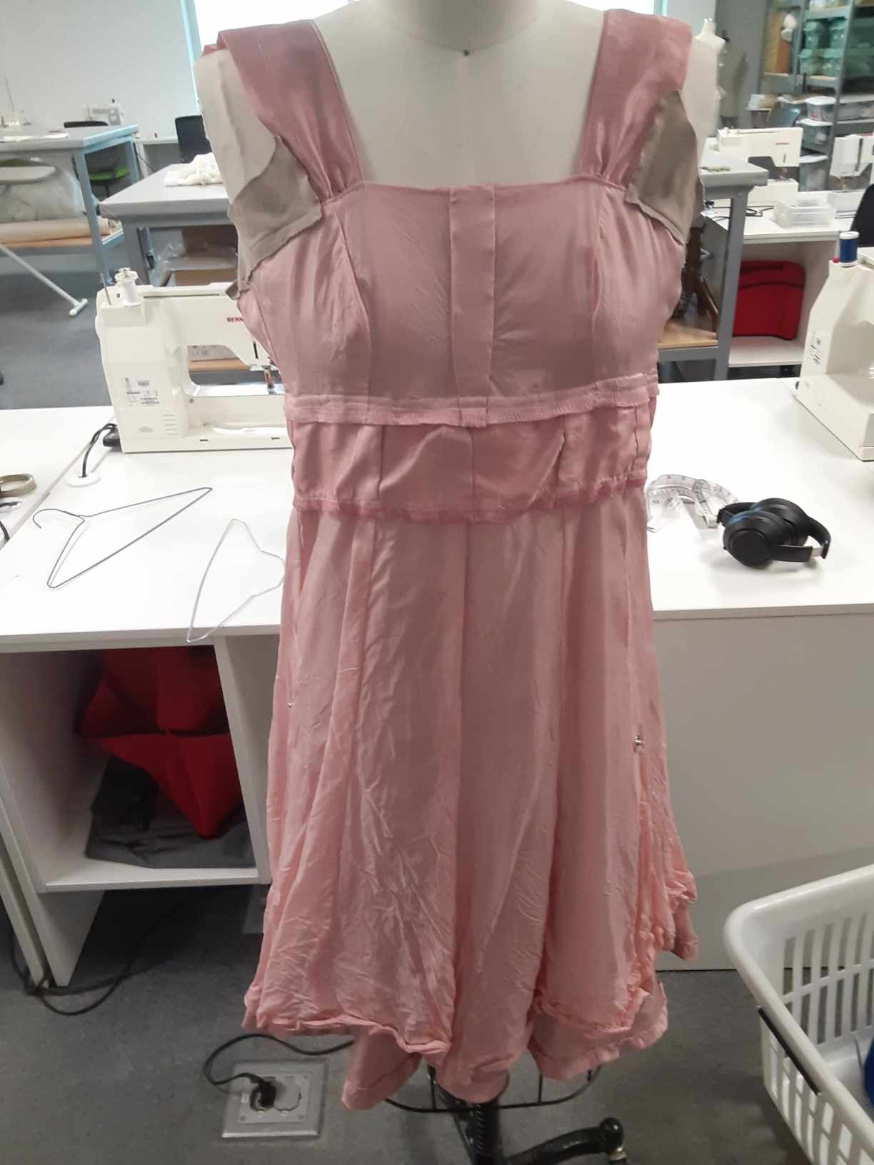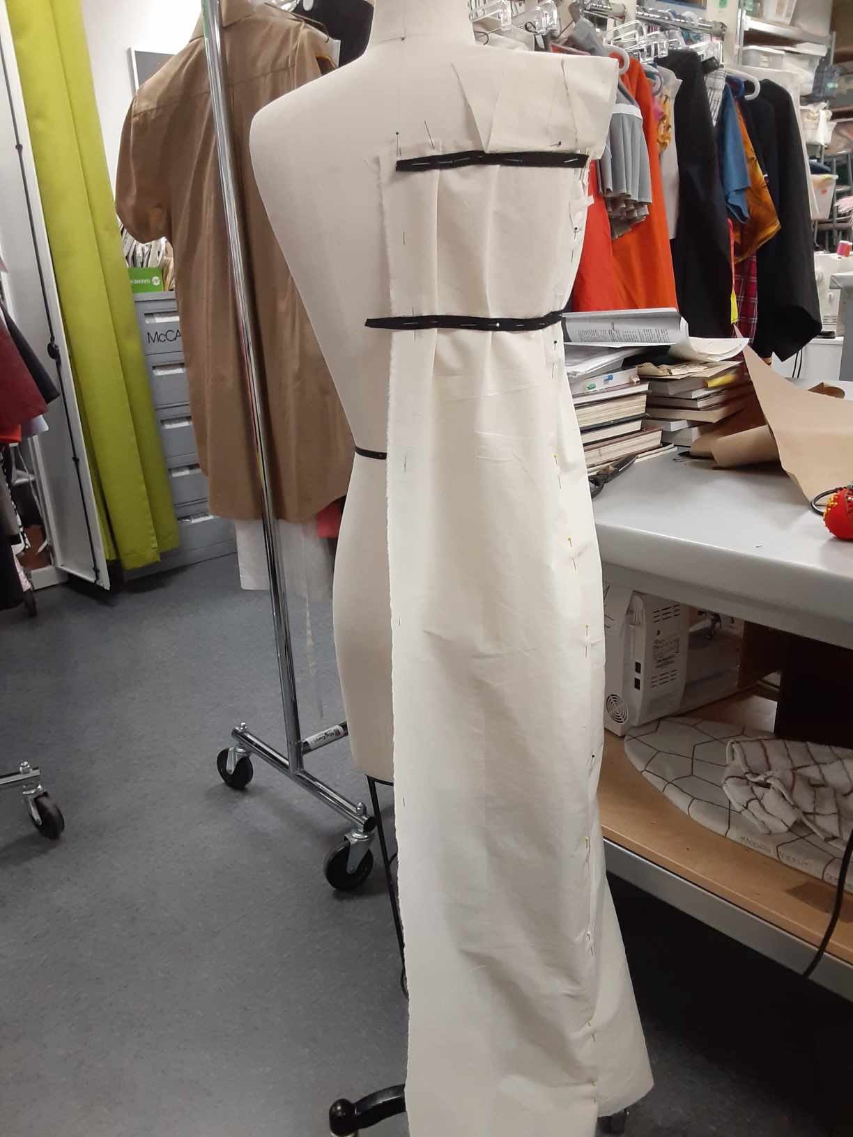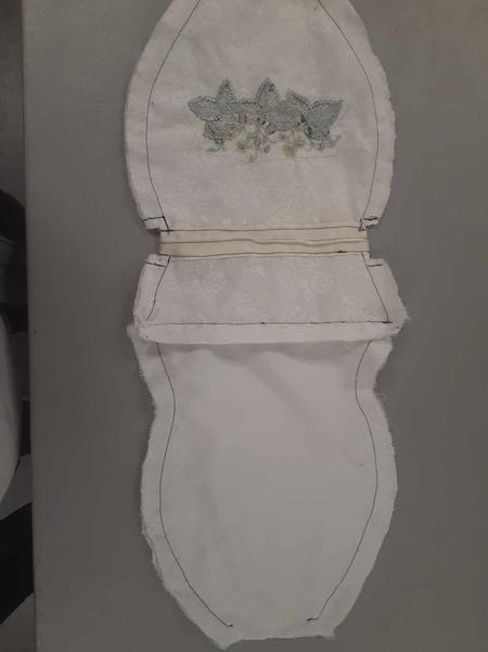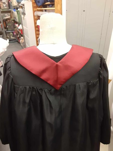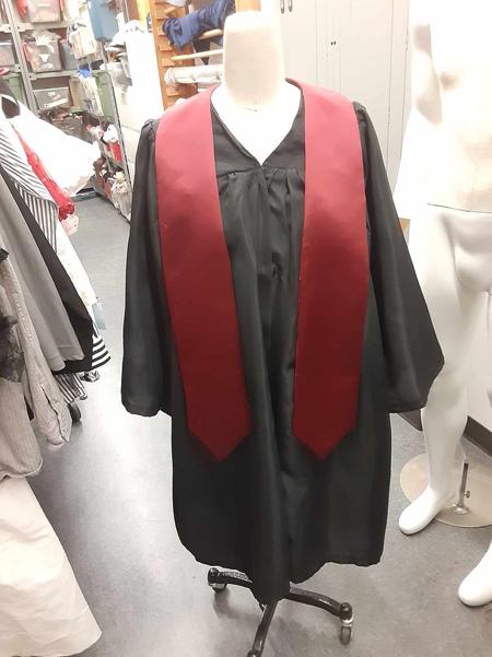 The alterations on the "Too Bride" had me deconstruct the dress and reconstruct it with both size and design alterations. I drafted the Graduation stoles from a visual reference and built 16 stoles in total, I also performed the majority of alterations on the Graduation Gowns (including tacking the stoles to the gowns).