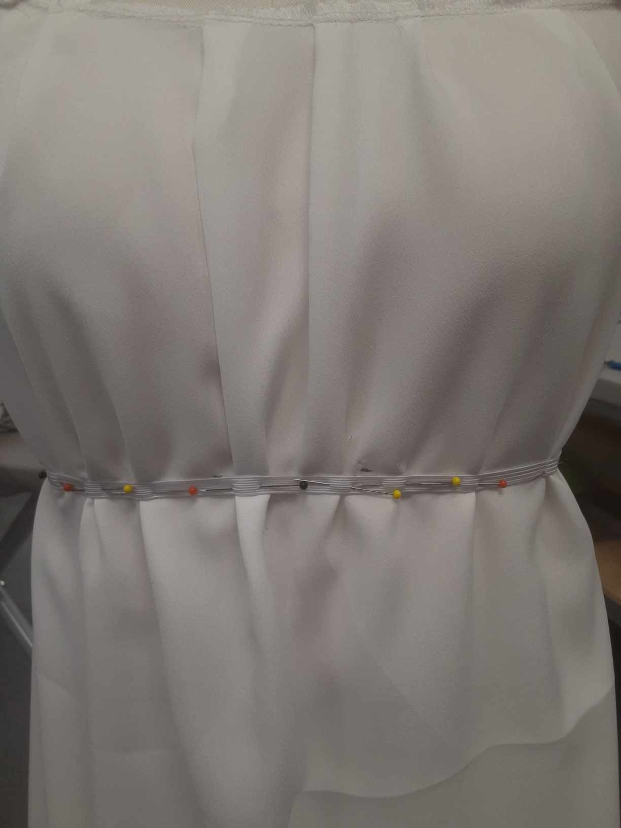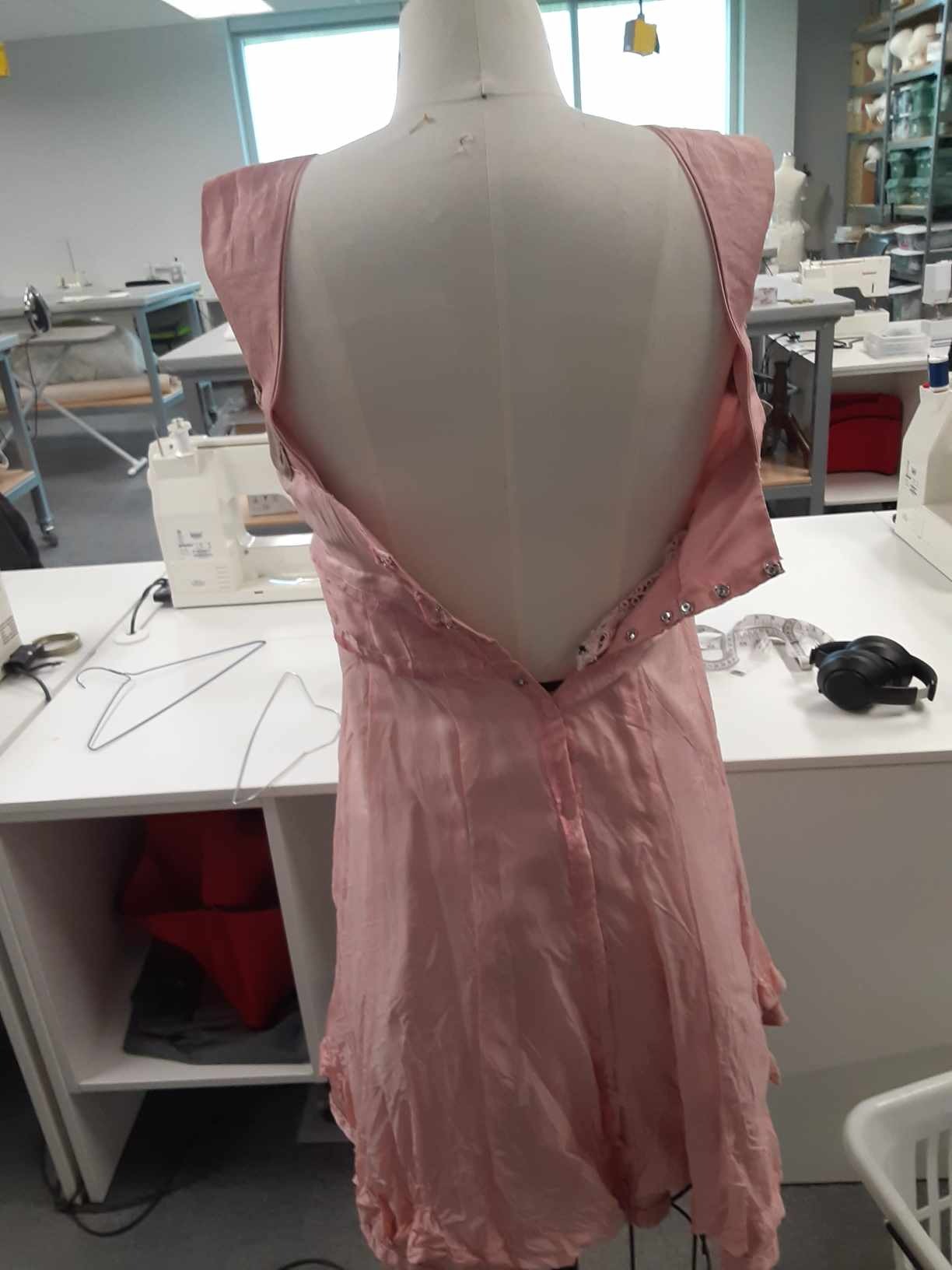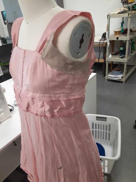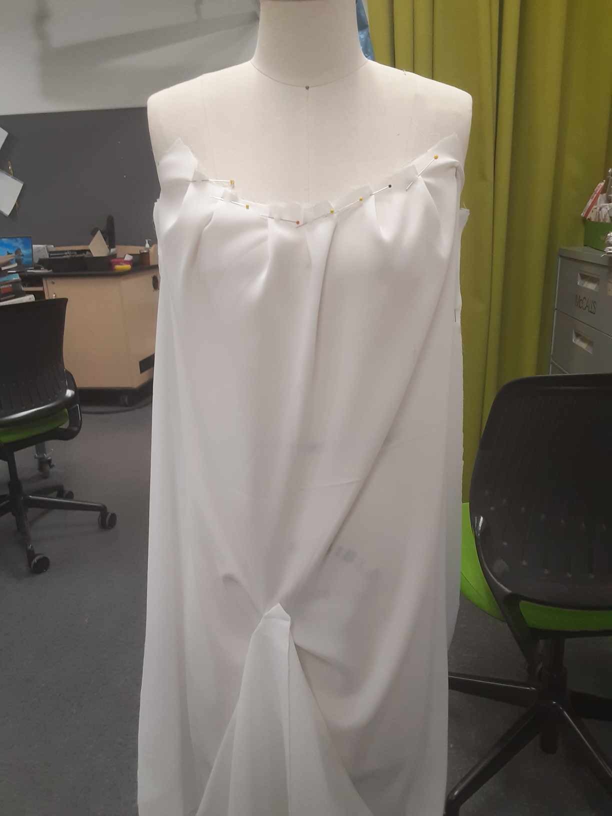 The alterations on the "Too Bride" had me deconstruct the dress and reconstruct it with both size and design alterations. I drafted the Graduation stoles from a visual reference and built 16 stoles in total, I also performed the majority of alterations on the Graduation Gowns (including tacking the stoles to the gowns).