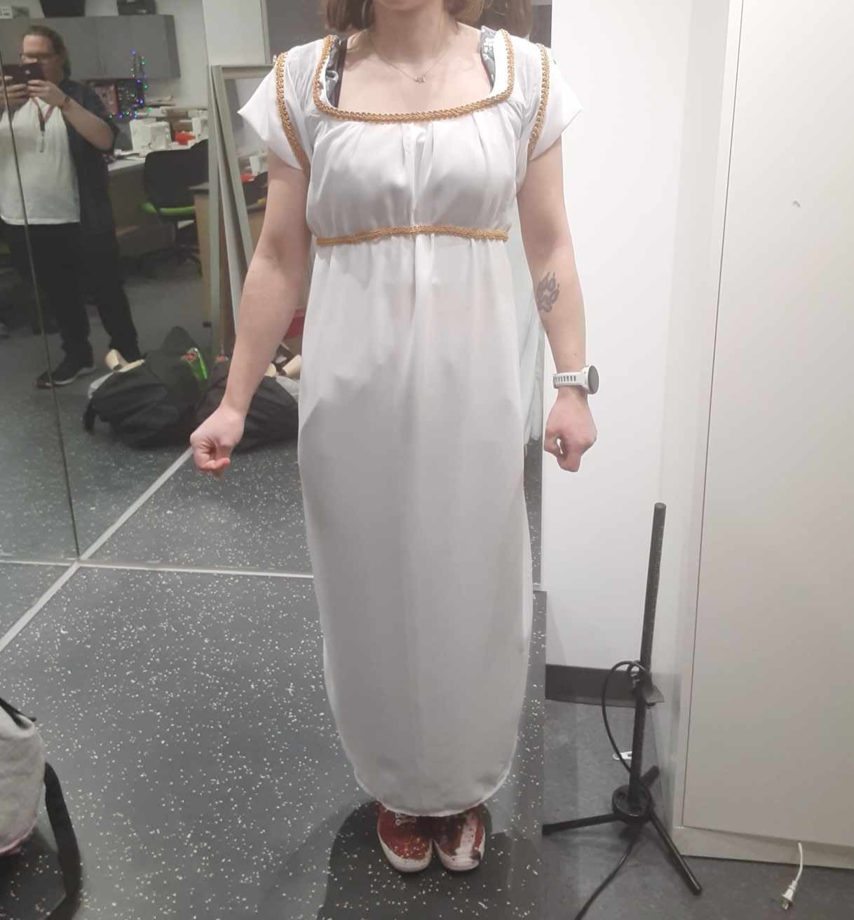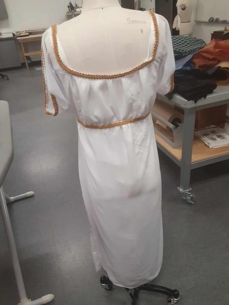 This was a re-creation of the late 18th century "Empire Style Dress", popular in Empire era France, and is modelled specifically after the dress portrayed in "Madame Charles Maurice de Talleyrand Périgord (1761–1835)" by François Gérard.