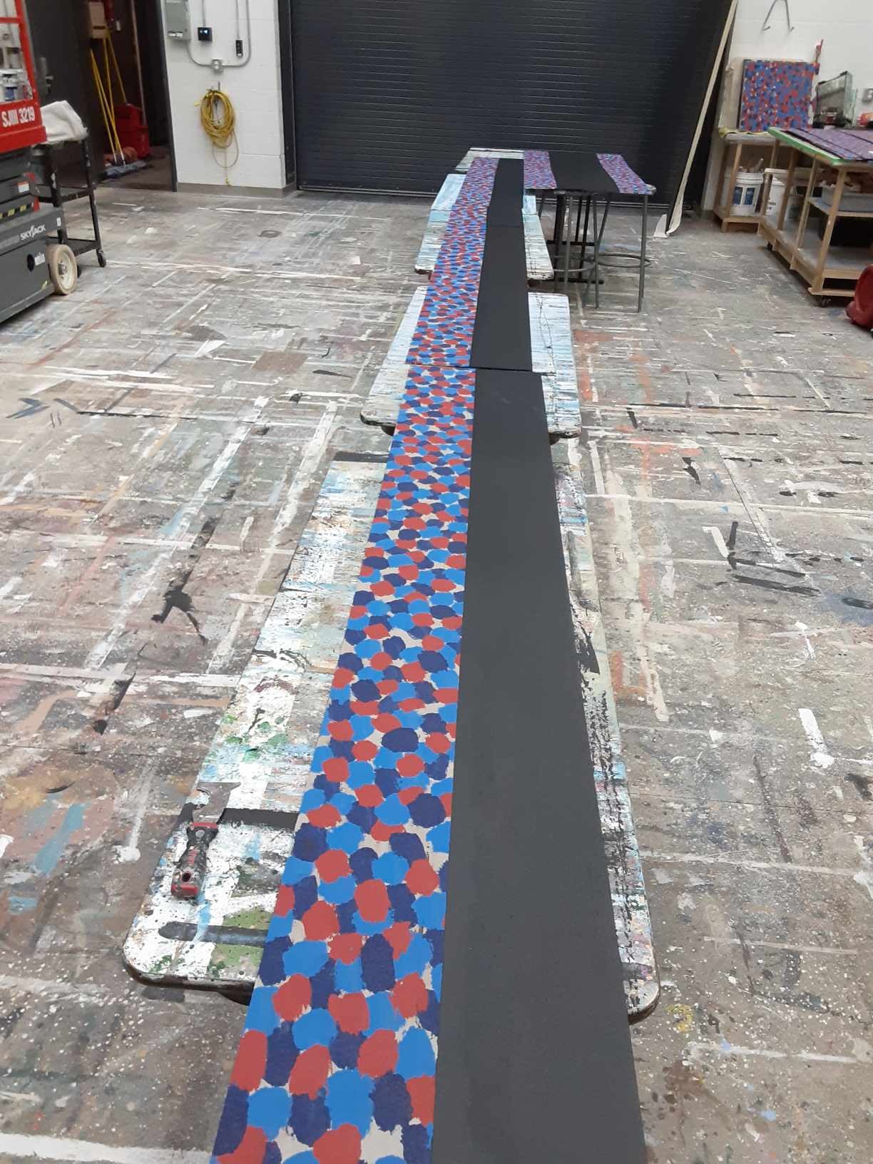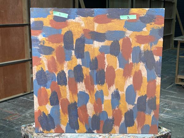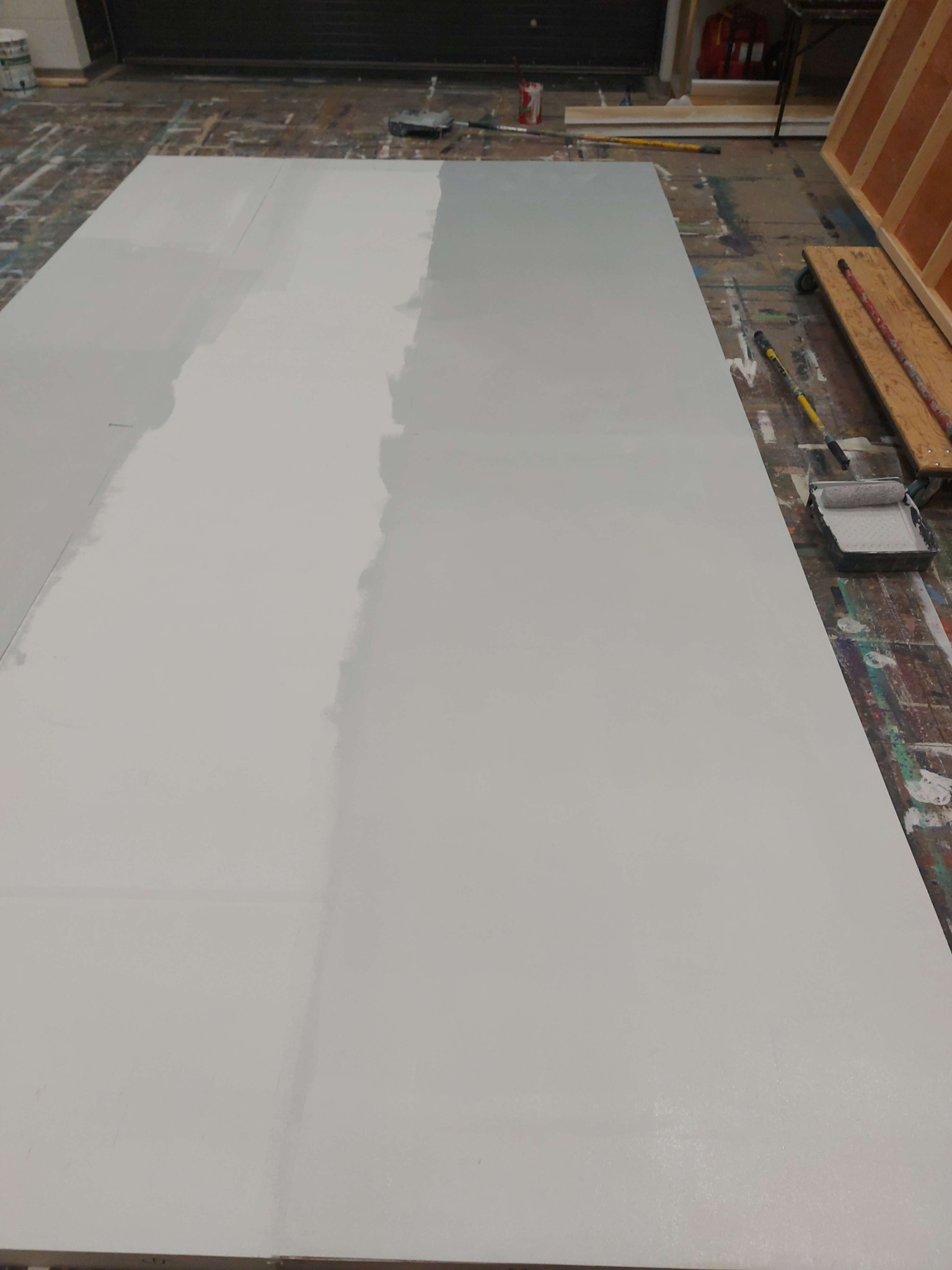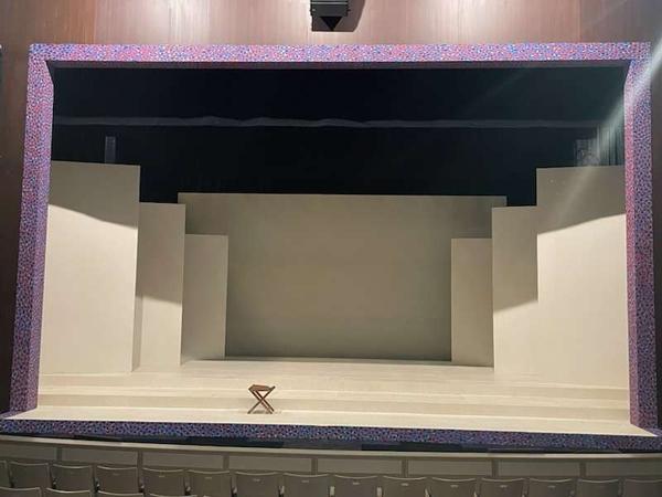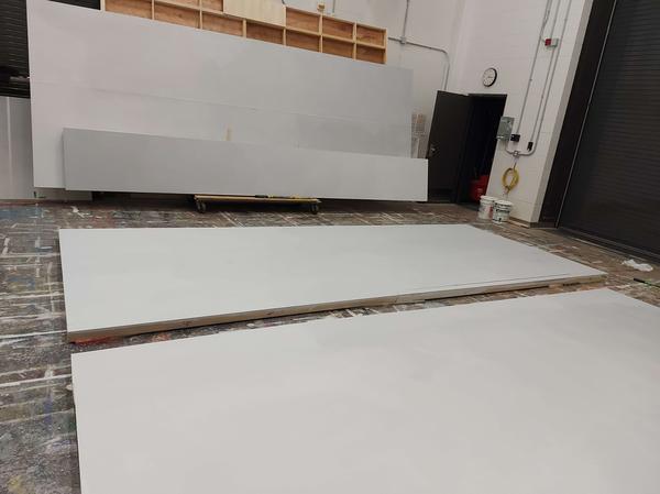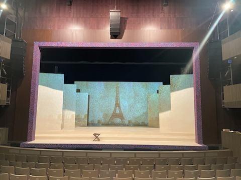 For this show I got a lot of experience with colour mixing and making paint sample boards. Most of the paint colours that I mixed for this show were mixed to match specific sources like the woodgrain that was painted to match the theatre's existing proscenium or the pointillism that was designed to imitate George Surats' famous technique. This show was a feat due to its massive scale and the small crew size, that being myself, the monitor and a singe crew member. The large flats served as projection surfaces, the set acting as one large canvas, which proved more complex than it sounds as we utilized multiple textured off-white techniques for the flats, risers and moving truck pieces.