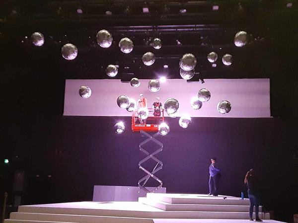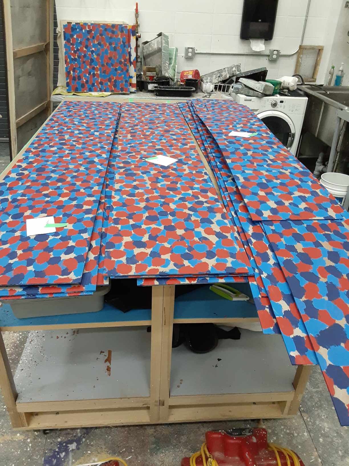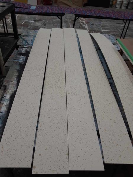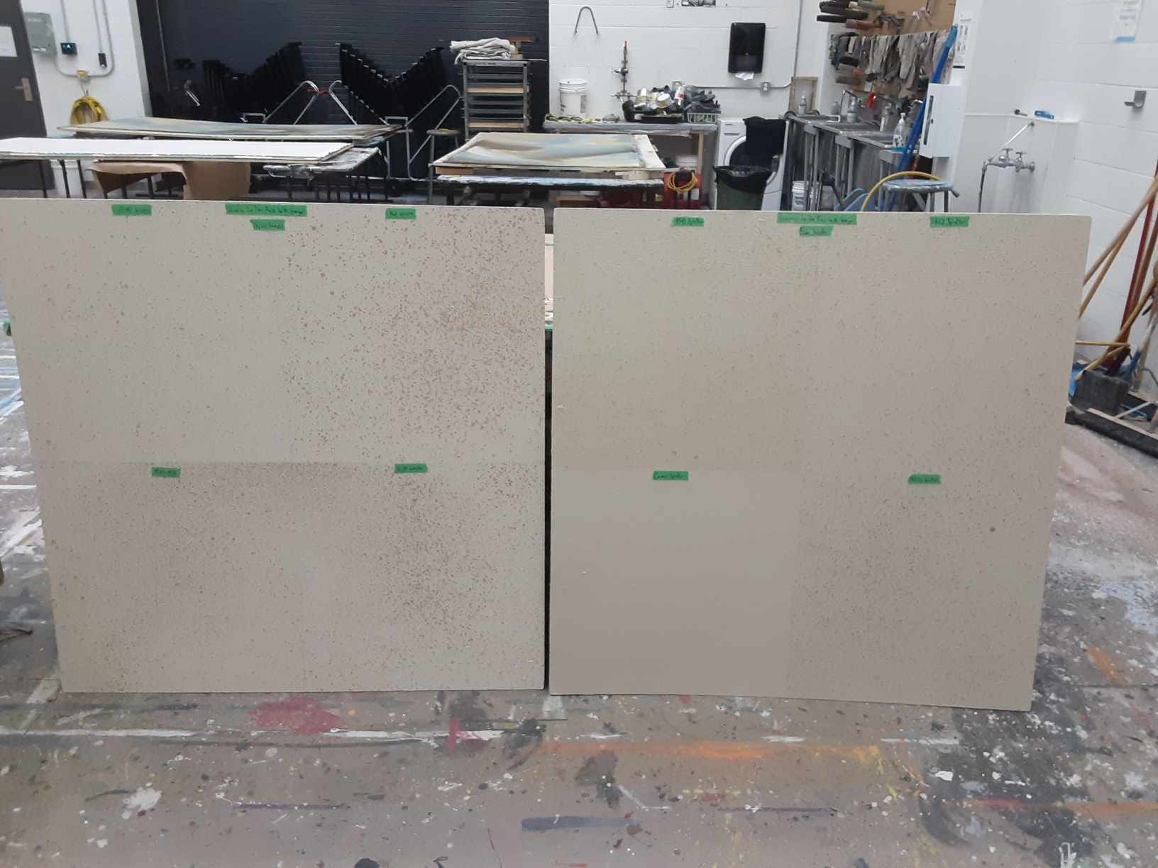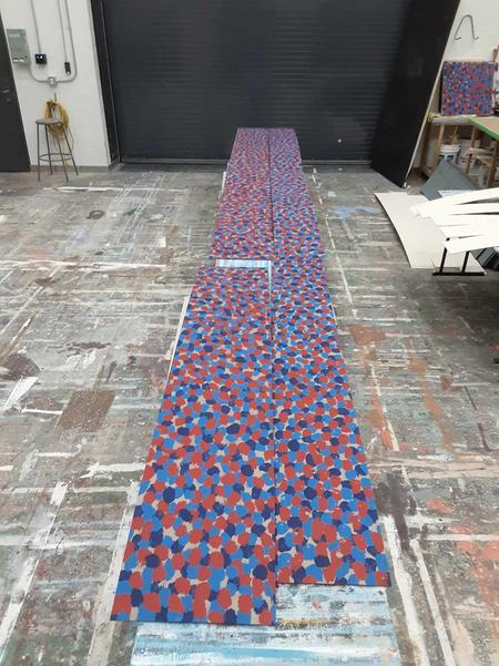 For this show I got a lot of experience with colour mixing and making paint sample boards. Most of the paint colours that I mixed for this show were mixed to match specific sources like the woodgrain that was painted to match the theatre's existing proscenium or the pointillism that was designed to imitate George Surats' famous technique. This show was a feat due to its massive scale and the small crew size, that being myself, the monitor and a singe crew member. The large flats served as projection surfaces, the set acting as one large canvas, which proved more complex than it sounds as we utilized multiple textured off-white techniques for the flats, risers and moving truck pieces.