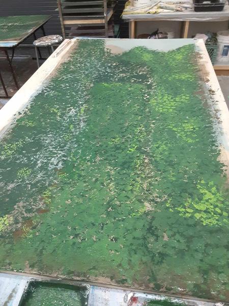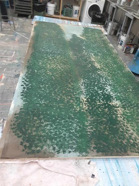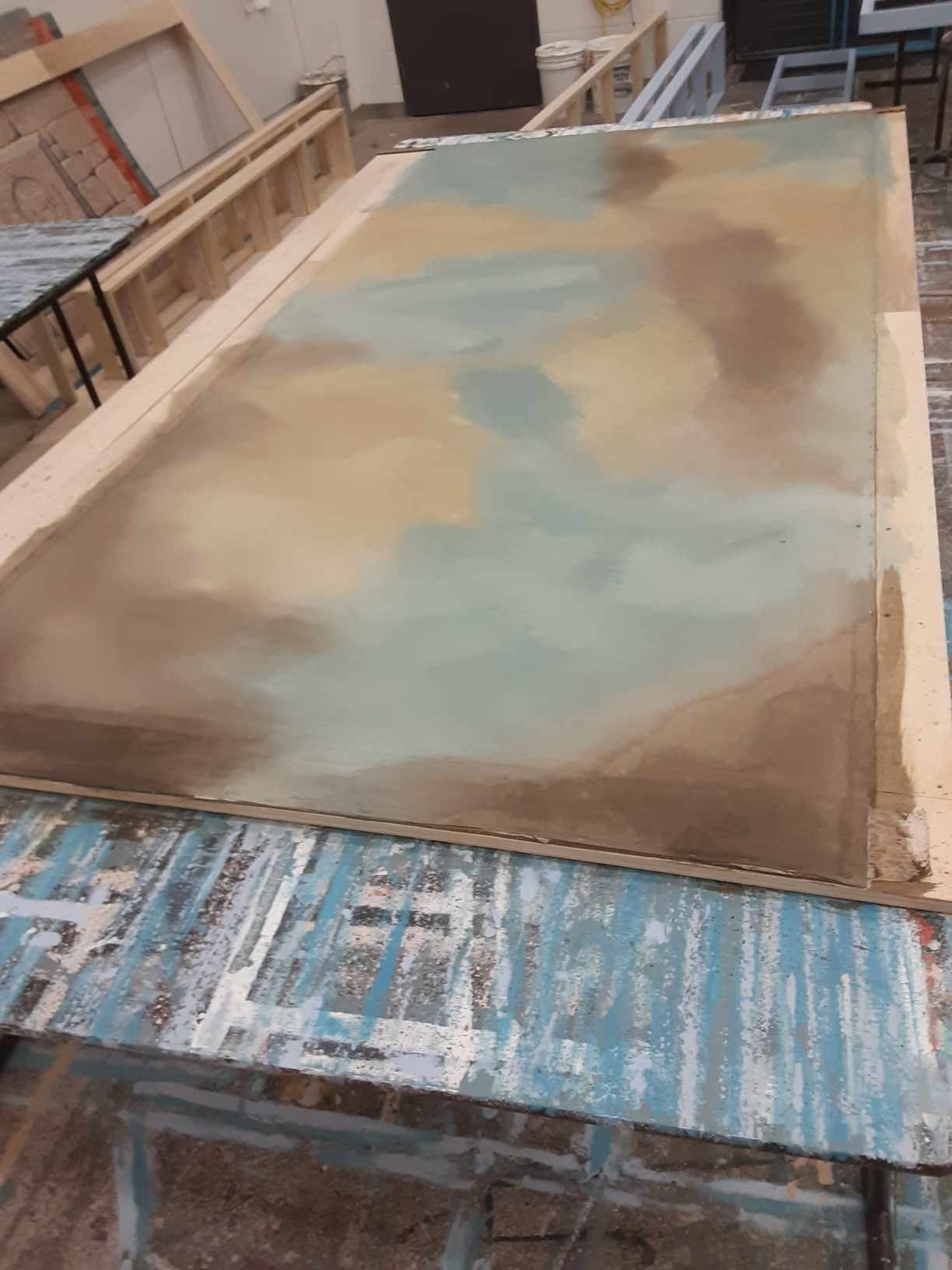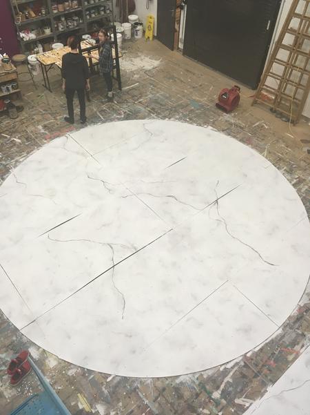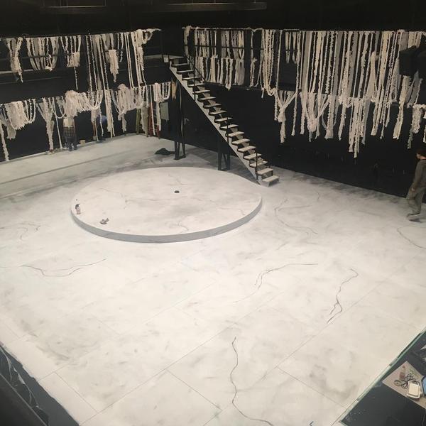 This show utilized a marbling technique that spanned the entire stage floor and revolve. I got very familiar with this technique and got to practice nearly every part of the process; rolling the paint, spraying the set with water, broom brushing colours in and splattering.