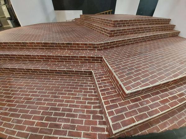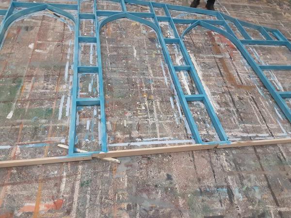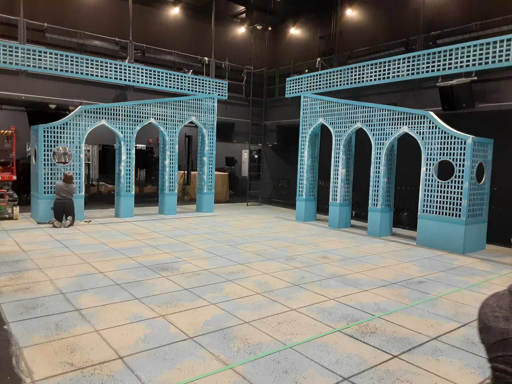 I got to work with a lot of new and interesting techniques for this show. I got to work with stretching and sizing fabric for backdrops, using unique brush alternatives like cobweb brushes and feather dusters, and scumbling hundreds of strips of wood for lattice work.